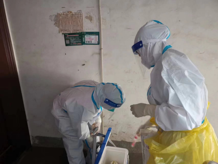 11月2日下午4点30左右,县委发布紧急封控通知,她们又接到了新任务:前往商贸街,开展全民核酸检测。社区3000多人,都是高风险人员,可疫情不允许她们有喘息的机会,马上又投入了战斗。接下来,她每天调5点30的闹钟,6点出门,穿上防护服,不敢多喝水,不敢吃有水分的食物,不能上厕所,不能休息,每当脱下防护服的时候,已是凌晨两三点。5号早上,何海燕天没亮就出门了,直到下午近3点才吃午饭,此时,她胆囊位置一阵一阵地刺痛,痛的频率越来越大,腰椎也已痛得钻心!大颗大颗的汗珠不断滚下来,身边的同事劝她请假休息一天,她拒绝了,她倔强地说:“我们身边的志愿者一个又一个被拉去隔离了,封控区越来越多,社区工作人员紧张,这个时候我怎么能去休息?”她咬牙坚持完成任务。