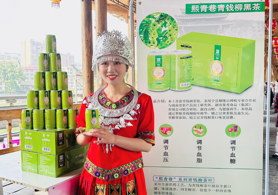 产能过剩青钱柳陷困境 青钱柳在绥宁俗称“摇钱树”,生长在海拔500至2500米的湿润山地,2016年7月4日,原国家质检总局批准对“绥宁青钱柳茶实施地理标志产品保护”。李熙桥镇塘玄湾村是绥宁县青钱柳树种植最为集中的地方,村里以独特工艺加工出来的青钱柳系列保健茶,较普通青钱柳茶叶风味更独特,受到消费者青睐。 该村青钱柳虽然品质上乘,价值非常高,但极度依赖绥宁本土市场,暂未打开对外销路,随着本土市场趋于饱和,同质化的青钱柳产品开始过剩,粗放式初加工这种传统模式的盈利空间被不断挤压,塘玄湾村青钱柳产业“得天”却不“独厚”,该村党支部书记付舒斌看着漫山优质青钱柳茶叶,不禁摇头叹息:“青钱柳是我村的宝贵资源,可惜没有得到充分的开发利用,这样下去种茶的人会越来越少”。如何转变青钱柳产业赛道,找到突围方式,重获新生,成了该镇党委政府和村支两委最头疼的事情。 “村企联建”趟出新路子 自2022年实施村企联建以来,湖南省稀土集团与塘玄湾村达成合作,共同寻找破局之路。在多次考察之后,大家一致认为,塘玄湾村青钱柳产业缺乏自己的品牌,知名度不高,且在制作工艺上亟待创新。在省稀土集团的牵线搭桥下,塘玄湾村的青钱柳被送到湖南省茶叶集团。此前,省茶叶集团已研发出一种黑茶饮料,他们认为黑茶味苦,青钱柳味甘,二者中和,能更好地调和口感,营造出更为丰富的茶香味道。为了将研发成果转化为产品顺利投入市场,通过湖南省国资委驻绥宁县对口帮扶小组牵线搭桥,镇党委政府成功与果秀集团取得联系,经过该集团实地考察之后,集团决定联手湖南农产品加工研究所、绥宁县烟堡山种植专业合作社共同研制和开发青钱柳黑茶。“党支部+龙头企业+合作社+农户”的发展模式正式形成。 2023年5月,“熙青巷·果秀”青钱柳黑茶顺利诞生,并成功亮相2023年中国品牌日活动,李熙桥塘玄湾村青钱柳产业至此翻开了新的篇章。 “四八姑娘节”上露头角
