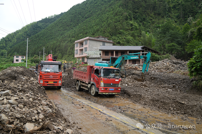 在金屋塘镇新华村,强降雨引发多处山体滑坡和泥石流,大量土石倾泻至路面,致使多条公路中断。X001线K11+300受灾现场,公路部门抢险队伍正紧张作业。挖掘机挥舞机械臂清除堆积土石,装载机来回穿梭运输杂物,施工人员在泥泞道路上有序指挥,保障作业安全高效。 绥宁县公路建设养护中心副主任汤春晖介绍:“6月8日金屋塘普降暴雨,导致X001线交通中断。当日早上5点多接到通知后,我们立即启动应急预案,紧急调配4台挖机、2台铲车赶赴现场,于上午11点抢通道路。”