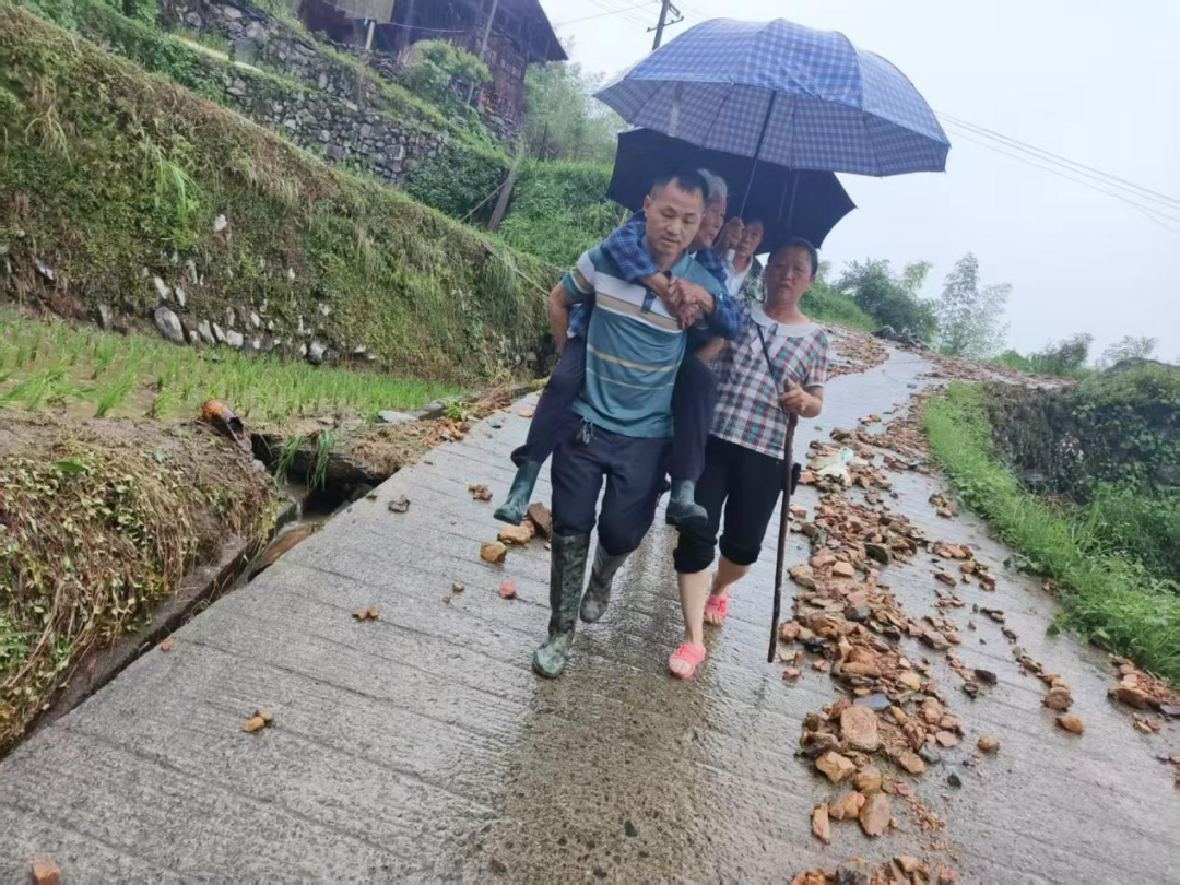 面对强降雨,唐家坊镇党委迅速启动“战时机制”,吹响防汛“集结号”。138名党员干部和志愿者组成“防汛突击队”,开展逐户排查隐患、疏通排水渠、设置警示标志等行动,在此过程中同步完成6户20名群众安全转移工作。针对扶水河水位陡涨情况,85名“护河先锋队”亮党徽巡堤,通过高频巡查累计排险32次。 凌晨5时许,瓦屋塘镇杨家堂村党支部书记彭小荣带领4名党员志愿者敲响了中风老人刘大爷的家门:“刘叔,街上开始涨水了,咱们得马上走!”看着老人犹豫的神情,彭小荣二话不说蹲下身:“来,我背您!”于是,彭小荣背起刘大爷迅速转移到杨家堂村村级服务中心。 金屋塘镇党委迅速行动,全体干部提前结束休假,以最快速度奔赴防汛救灾一线,在道路中断、通信受阻的艰难处境下,带动片组邻“三长”各司其职、协同作战。 在逐户巡查时,金屋塘镇新华村“邻长”周厚和发现袁银玉老人家中遭遇山体滑坡、严重进水。情况紧急,他耐心劝说,成功让老人同意转移。袁奶奶家下方有段长下坡,路面湿滑,周厚和二话不说便主动将袁奶奶背在背上,邻居刘大姐见状立刻给他们撑起雨伞,一同将袁奶奶安全护送至安置点。袁奶奶握紧周厚和的手热泪盈眶地说:“这么大的雨,这么险的路,多亏了你啊!”