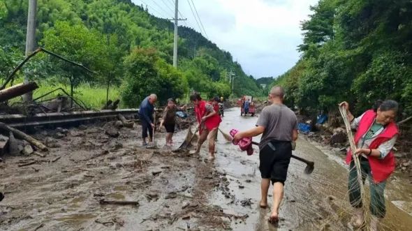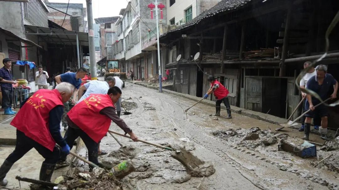 党员干部冒雨踏勘现场,科学制定“双水源保障+分段抢修”方案。在海拔800米的陡峭山涧,抢修队员徒手清理淤积泥石;在近30米深的水井旁,技术人员连续8小时检测水质。经过15小时鏖战,6月9日凌晨1点,清澈甘泉重新涌入千家万户。 金屋塘镇街道上,随处可见党员干部、志愿者与自发前来打扫的村民,他们分工协作、密切配合,手拿铁锹、扫帚等工具,奋力清理着堆积的淤泥和垃圾。在大家的共同努力下,道路及院落堆积的淤泥被一点点地清理干净。金屋塘镇有关负责同志告诉记者:“洪水过后我们迅速组织镇村干部、党员50余人,全力集中对镇老街进行清淤。截至6月10日中午,已全面完成清理,确保集镇居民出行畅通。”