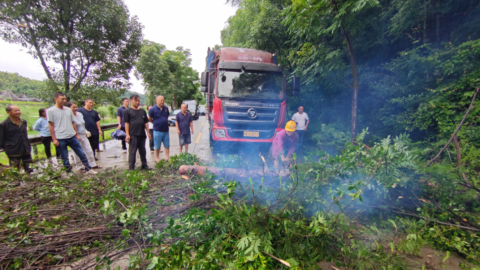 6月22日下午,乐安铺苗族侗族乡大团村主干道(高速路口必经路段)一棵直径40厘米的大树倒伏阻断交通,大团村组长陆安全冒雨作业,独自操作油锯,仅用10分钟便完成清障,保障了40余辆滞留车辆顺利通行。这样的“闪电速度”源于常态化的实战演练。2025年来,该乡组建9支应急小队,培训油锯操作人员20余人,开展应急演练4场次。 全力以赴,们是家园的“守护者” 东山侗族乡东山村与牛背岭村交界处,持续暴雨导致河道水位暴涨,两村20余亩红提园沦为“泽国”,一串串快成熟的红提浸泡在浑浊的积水中。党员干部踩着没踝的泥水逐一查看灾情,一边指导农户清理沟渠排水,一边安排果农尽快排水。该乡双门村红提种植大户龙大姐望着被淹的果园心急如焚,党员干部现场办公,协调抽水设备连夜作业。“多亏党员干部的帮忙,不然这季收成全完了。”龙大姐看着在果园里忙碌的党员干部说道。