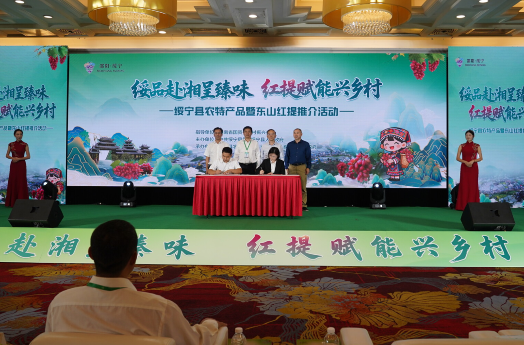 洽谈区里,绥宁种植大户、产业协会代表与采购商一对一沟通红提采购量、供货周期等细节,部分企业现场达成初步合作意向;品鉴区的主播同步开启直播,线上发放优惠券、预售产品,直播间互动热烈,订单不断。 上午10点30分,推介会正式拉开帷幕。随着绥宁东山红提宣传片的播放,现场观众仿佛走进青山环绕的红提基地。主持人介绍,绥宁地处湘西南,优良生态为红提生长提供得天独厚条件,目前红提种植已成为当地农民增收的重要产业。 唐枝在欢迎辞中表示,此次带优质农特产品来长沙,既是推介也是寻求合作,希望以红提为媒,让绥宁产品走向更广阔市场。 欧文指出,消费帮扶是乡村振兴的重要举措,此次活动搭建了精准对接平台,未来将持续支持绥宁特色产业,推动其农特产品融入高端市场。
