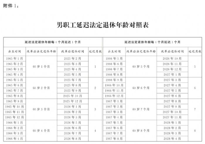 附件: 1.男职工延迟法定退休年龄对照表 2.原法定退休年龄五十五周岁的女职工延迟法定退休年龄对照表 3.原法定退休年龄五十周岁的女职工延迟法定退休年龄对照表 4.提高最低缴费年限情况表 |