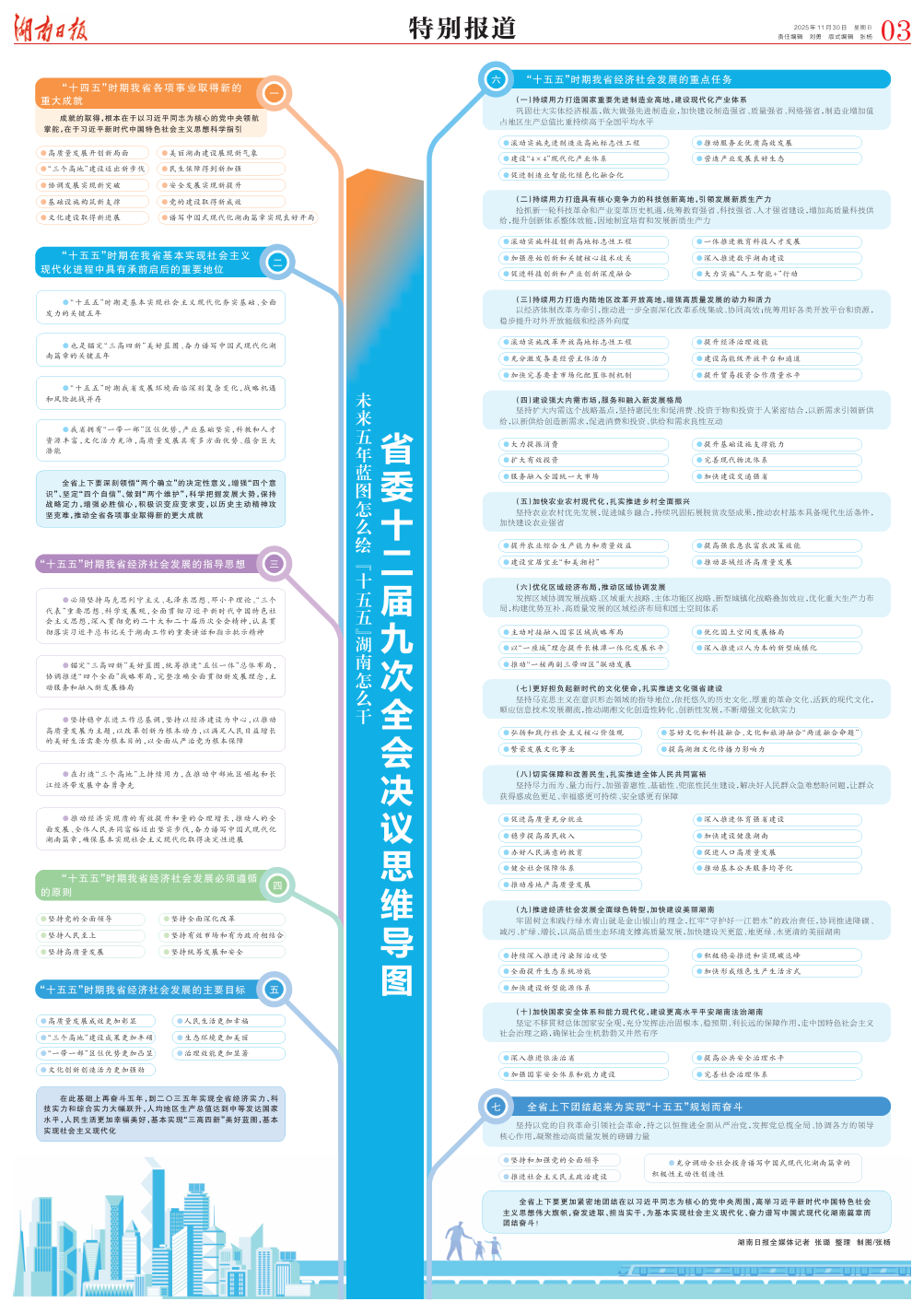 一、“十四五”时期我省各项事业取得新的重大成就 成就的取得,根本在于以习近平同志为核心的党中央领航掌舵,在于习近平新时代中国特色社会主义思想科学指引 ●高质量发展开创新局面 ●“三个高地”建设迈出新步伐 ●协调发展实现新突破 ●基础设施构筑新支撑 ●文化建设取得新进展 ●美丽湖南建设展现新气象 ●民生保障得到新加强 ●安全发展实现新提升 ●党的建设取得新成效 ●谱写中国式现代化湖南篇章实现良好开局 二、“十五五”时期在我省基本实现社会主义现代化进程中具有承前启后的重要地位 ●“十五五”时期是基本实现社会主义现代化夯实基础、全面发力的关键五年 ●也是锚定“三高四新”美好蓝图、奋力谱写中国式现代化湖南篇章的关键五年 ●“十五五”时期我省发展环境面临深刻复杂变化,战略机遇和风险挑战并存 ●我省拥有“一带一部”区位优势,产业基础坚实,科教和人才资源丰富,文化活力充沛,高质量发展具有多方面优势、蕴含巨大潜能 全省上下要深刻领悟“两个确立”的决定性意义,增强“四个意识”、坚定“四个自信”、做到“两个维护”,科学把握发展大势,保持战略定力,增强必胜信心,积极识变应变求变,以历史主动精神攻坚克难,推动全省各项事业取得新的更大成就 三、“十五五”时期我省经济社会发展的指导思想 ●必须坚持马克思列宁主义、毛泽东思想、邓小平理论、“三个代表”重要思想、科学发展观,全面贯彻习近平新时代中国特色社会主义思想,深入贯彻党的二十大和二十届历次全会精神,认真贯彻落实习近平总书记关于湖南工作的重要讲话和指示批示精神 ●锚定“三高四新”美好蓝图,统筹推进“五位一体”总体布局,协调推进“四个全面”战略布局,完整准确全面贯彻新发展理念,主动服务和融入新发展格局 ●坚持稳中求进工作总基调,坚持以经济建设为中心,以推动高质量发展为主题,以改革创新为根本动力,以满足人民日益增长的美好生活需要为根本目的,以全面从严治党为根本保障 ●在打造“三个高地”上持续用力,在推动中部地区崛起和长江经济带发展中奋勇争先 ●推动经济实现质的有效提升和量的合理增长,推动人的全面发展、全体人民共同富裕迈出坚实步伐,奋力谱写中国式现代化湖南篇章,确保基本实现社会主义现代化取得决定性进展 四、“十五五”时期我省经济社会发展必须遵循的原则 ●坚持党的全面领导 ●坚持人民至上 ●坚持高质量发展 ●坚持全面深化改革 ●坚持有效市场和有为政府相结合 ●坚持统筹发展和安全 五、“十五五”时期我省经济社会发展的主要目标 ●高质量发展成效更加彰显 ●“三个高地”建设成果更加丰硕 ●“一带一部”区位优势更加凸显 ●文化创新创造活力更加强劲 ●人民生活更加幸福 ●生态环境更加美丽 ●治理效能更加显著 在此基础上再奋斗五年,到二〇三五年实现全省经济实力、科技实力和综合实力大幅跃升,人均地区生产总值达到中等发达国家水平,人民生活更加幸福美好,基本实现“三高四新”美好蓝图,基本实现社会主义现代化 六、“十五五”时期我省经济社会发展的重点任务 (一)持续用力打造国家重要先进制造业高地,建设现代化产业体系 巩固壮大实体经济根基,做大做强先进制造业,加快建设制造强省、质量强省、网络强省,制造业增加值占地区生产总值比重持续高于全国平均水平 ●滚动实施先进制造业高地标志性工程 ●建设“4×4”现代化产业体系 ●促进制造业智能化绿色化融合化 ●推动服务业优质高效发展 ●营造产业发展良好生态 (二)持续用力打造具有核心竞争力的科技创新高地,引领发展新质生产力 抢抓新一轮科技革命和产业变革历史机遇,统筹教育强省、科技强省、人才强省建设,增加高质量科技供给,提升创新体系整体效能,因地制宜培育和发展新质生产力 ●滚动实施科技创新高地标志性工程 ●加强原始创新和关键核心技术攻关 ●促进科技创新和产业创新深度融合 ●一体推进教育科技人才发展 ●深入推进数字湖南建设 ●大力实施“人工智能+”行动 (三)持续用力打造内陆地区改革开放高地,增强高质量发展的动力和活力 以经济体制改革为牵引,推动进一步全面深化改革系统集成、协同高效;统筹用好各类开放平台和资源,稳步提升对外开放能级和经济外向度 ●滚动实施改革开放高地标志性工程 ●充分激发各类经营主体活力 ●加快完善要素市场化配置体制机制 ●提升经济治理效能 ●建设高能级开放平台和通道 ●提升贸易投资合作质量水平 (四)建设强大内需市场,服务和融入新发展格局 坚持扩大内需这个战略基点,坚持惠民生和促消费、投资于物和投资于人紧密结合,以新需求引领新供给,以新供给创造新需求,促进消费和投资、供给和需求良性互动 ●大力提振消费 ●扩大有效投资 ●服务融入全国统一大市场 ●提升基础设施支撑能力 ●完善现代物流体系 ●加快建设交通强省 (五)加快农业农村现代化,扎实推进乡村全面振兴 坚持农业农村优先发展,促进城乡融合,持续巩固拓展脱贫攻坚成果,推动农村基本具备现代生活条件,加快建设农业强省 ●提升农业综合生产能力和质量效益 ●建设宜居宜业“和美湘村” ●提高强农惠农富农政策效能 ●推动县域经济高质量发展 (六)优