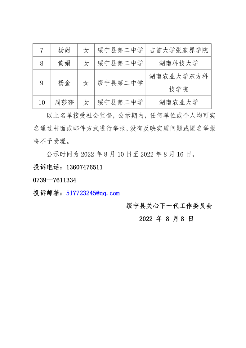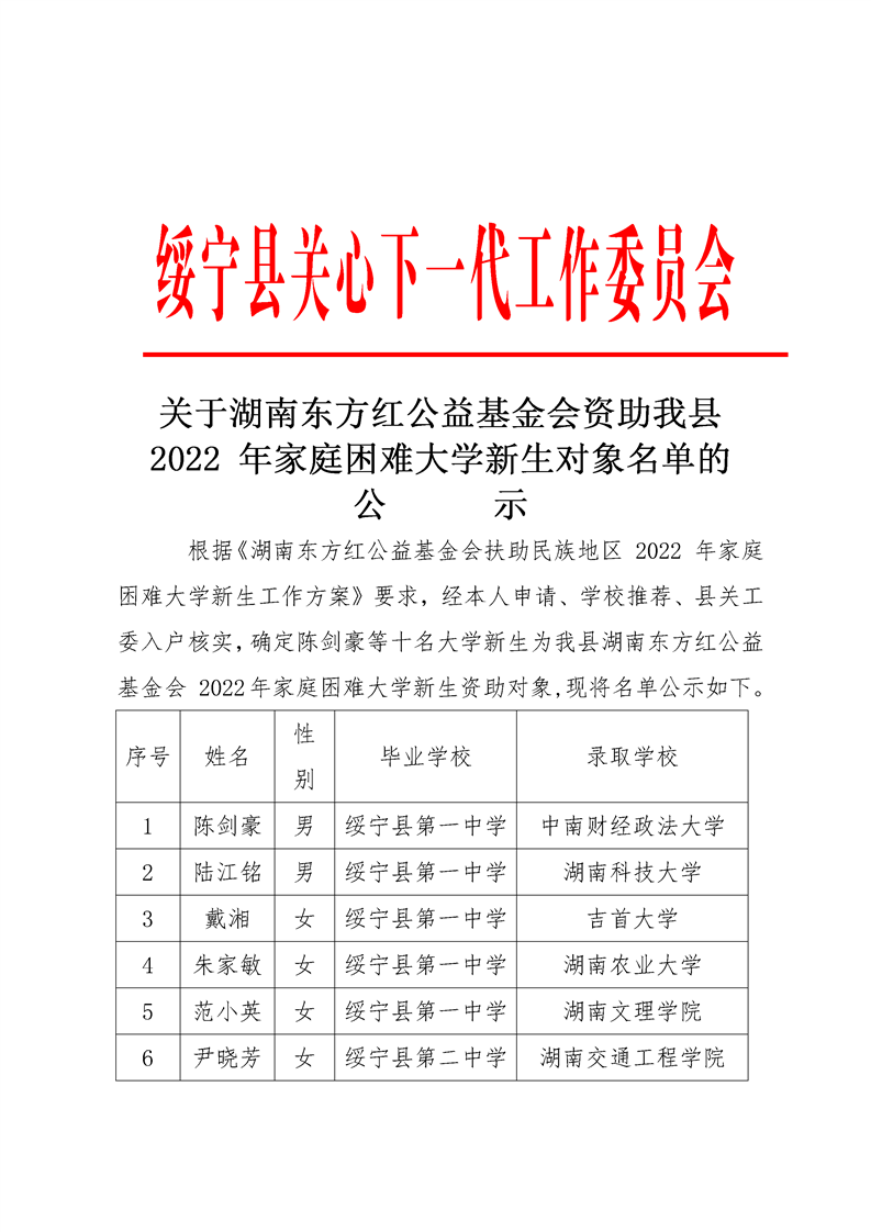 关于湖南东方红公益基金会资助我县 2022 年家庭困难大学新生对象名单的公示