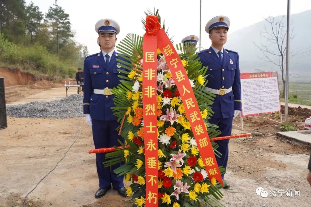 上午10时,在匡非非革命烈士墓碑前,全体人员整齐排列,表情肃穆,向长眠于此的革命烈士默哀。随后,在《献花曲》的伴奏下,礼兵托起花篮,缓缓走向烈士碑敬献花篮。