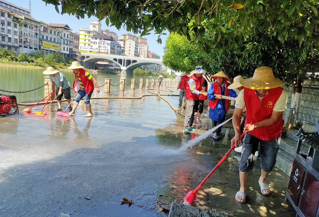 “马上就是姑娘节了,听说要来好多游客,还有外国朋友,我们社区要加倍努力工作,为节日创造一个整洁干净、优美舒适的环境。”5月13下午,长铺镇老桥头沿河边,长铺社区党支部书记成娟洪正撸起袖子冲洗巫水画廊。