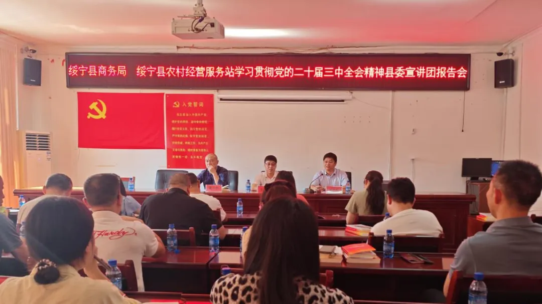 宣讲凝聚共识力,发展新添动力源。9月25日下午,县商务局、县农经站联合举办了党的二十届三中全会精神集中宣讲会,局机关及二级机构全体干部职工,下辖企业支部和老干支部的党支部书记参加。会议邀请了县委宣讲团成员、县文联主席向云峰主讲,县商务局主要负责同志在会上结合商务工作实际作了解读,进一步凝聚了思想共识,激发了干部职工的工作热情和创新活力,为各项工作的顺利开展奠定了坚实理论基础。
