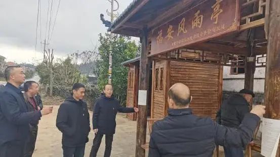 (筱电公司党支部验收大园村公交站台) “众安福安亭”,搭建交流新平台。目前筱电公司党支部援建的大园村四甲片公交站“众安风雨亭”“福安风雨亭”候车亭正式投入使用。这里不仅为村民候车提供了便利,还成为大家聚在一起“苗家款古”、热议村里大小事的绝佳场所,进一步拓展了村民间沟通交流的空间,促进了乡村和谐稳定。资源共享,攻克发展难题瓶颈。筱电公司党支部与大园村党总支通过企村党组织共建,搭建智囊平台,打造乡村治理“信息库”。联合党课、主题党日交流等活动提升党组织的凝聚力与战斗力。面对乡村发展过程中的基础设施建设、产业规划、人才培养等难题,企村双方凝聚合力,发散发展思维,共同研究对策,充分调动各方资源,走出了一条党建联建、资源联享、难题联解的发展新路径,为大园村的长远发展筑牢了基础。
