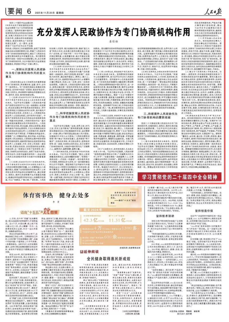 11月20日,《人民日报》要闻版刊发第十四届全国政协副主席姜信治署名文章《充分发挥人民政协作为专门协商机构作用》。